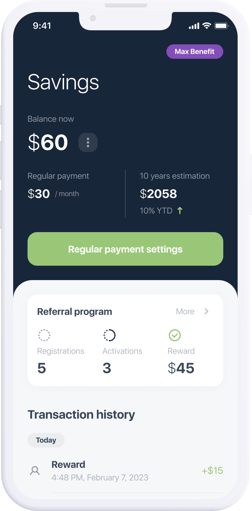 $9 monthlyThis one is for people who are interested in minimal risk in order to ensure that their financial goal will be achived in time. In the case decrease in the yield below the floor, BenifMe will pay additional own funds to the minimum level of income for clients, until the breake even of the business
